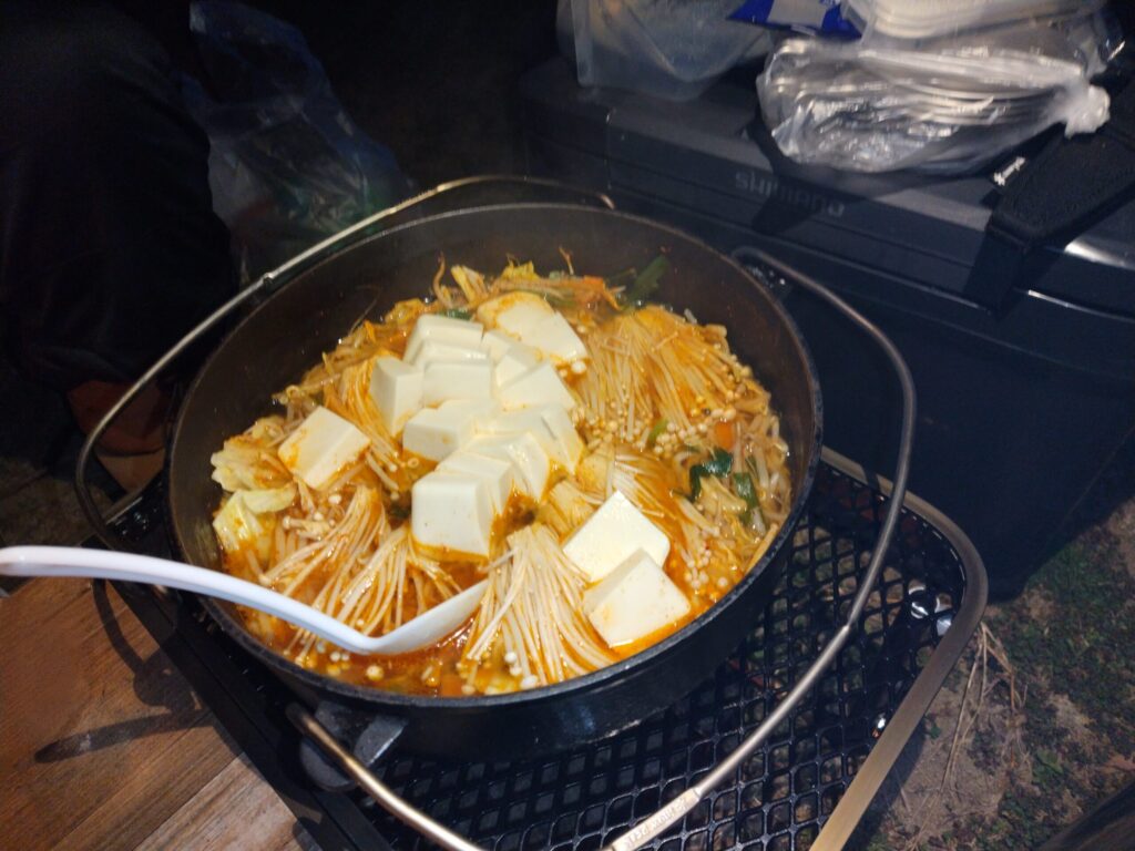 こんにちは!寒いキャンプ場で温まりたいなら、キムチ鍋の〆にぴったりな「キムチ鍋→うどん」はいかがでしょうか?鍋の残り汁を活かして、うどんを投入するだけで旨みがぐっと増す一品です。