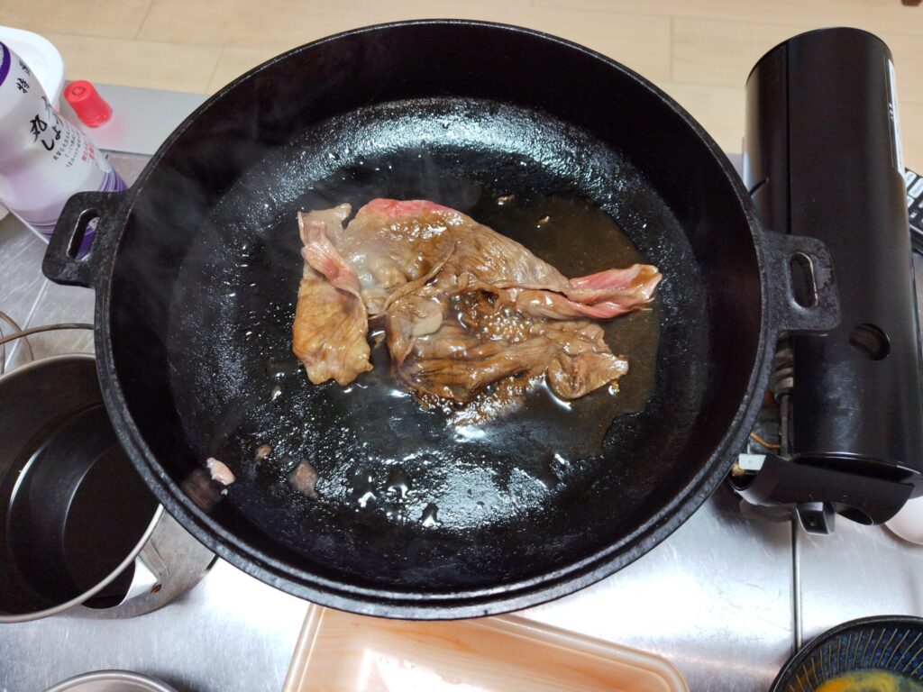 - フライパンを温め、牛肉を焼きます。