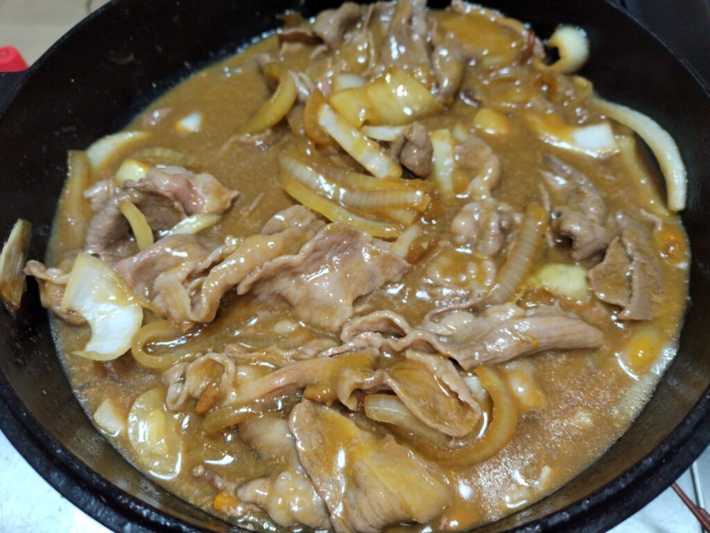 - 牛肉のあとに野菜を加え、タレで味を整えて煮込みます。