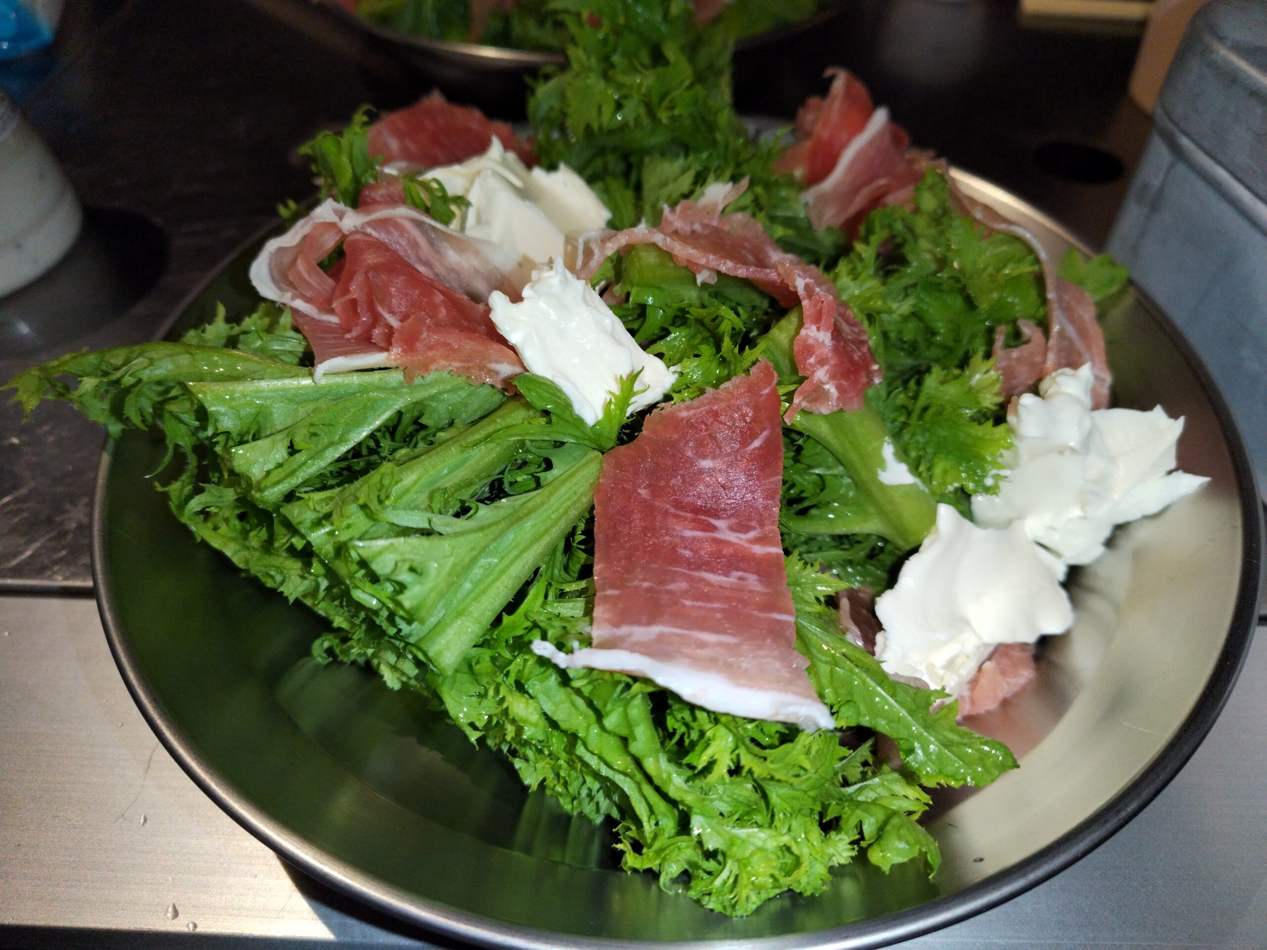 - わさび菜はピリッとした辛味とシャキシャキ食感が特徴。生ハムの塩気とよく合います。
