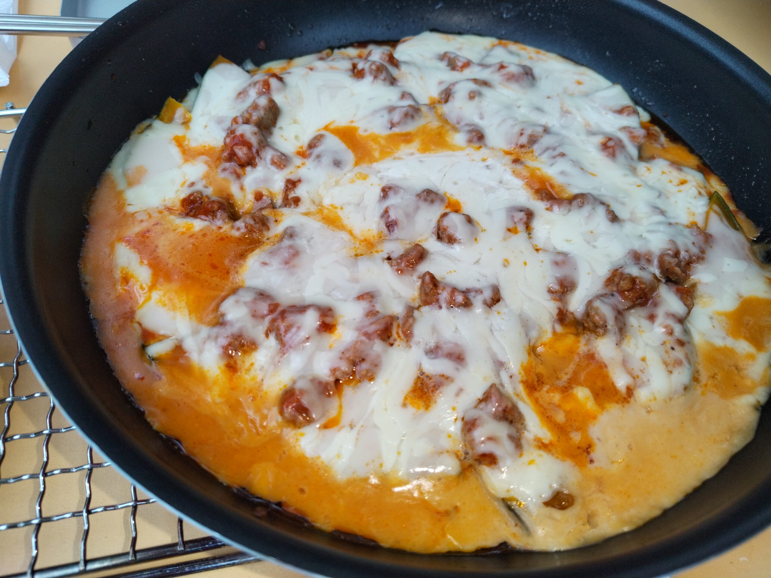 - カボチャが柔らかくなったら、ホワイトソース→ミートソース→チーズの順で乗せる。