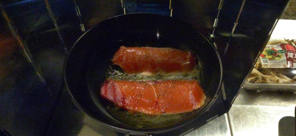 - フライパンでバターを溶かし、鮭に塩胡椒を振って焼きます。