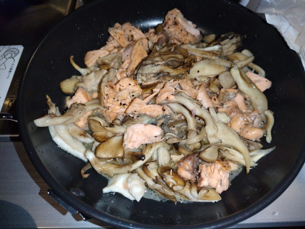 - 鮭と舞茸に火が通ったら、鮭を大きめにほぐします。