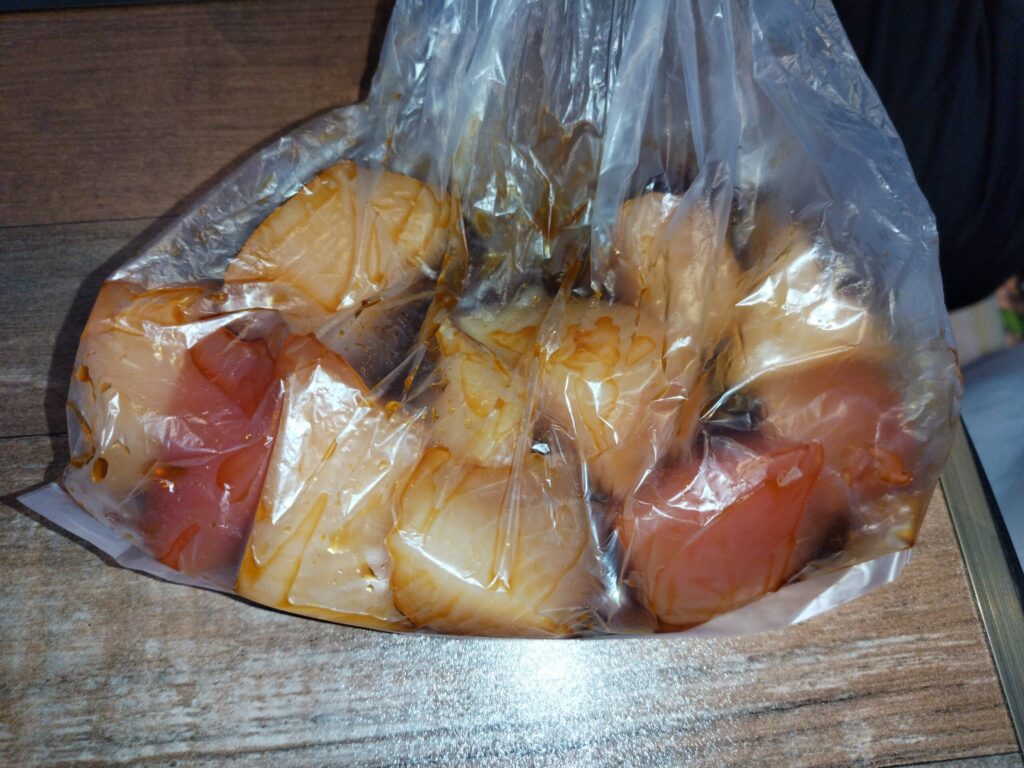 - アイラップやジップ袋にまぐろの切り落としとまぐろ丼のタレを入れ、空気を抜いて軽く揉みます。
