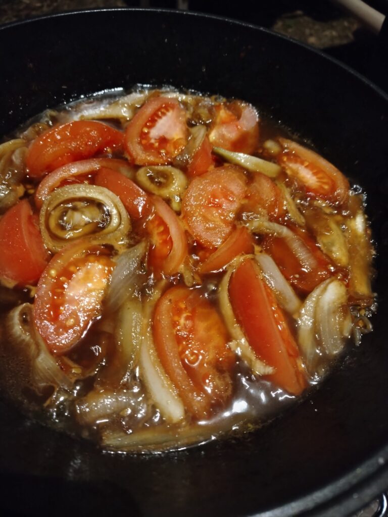 - 火にかけ、具材に火が通ってきたらトマトを加える。