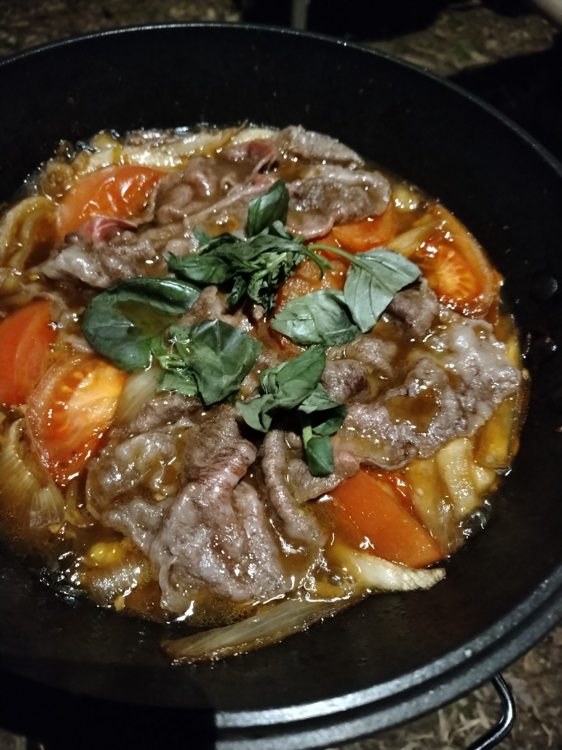 こんにちは!今回は、アウトドアで楽しみたい“ちょっと変わり種”の鍋料理、「トマトすき焼き鍋」をご紹介します。 すき焼きの甘じょっぱさにトマトの爽やかな酸味が合わさって、コク深くて意外なおいしさ。 準備もしやすく、具材の旨みが溶け込んだスープまで楽しめる一品です。
