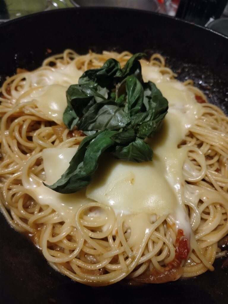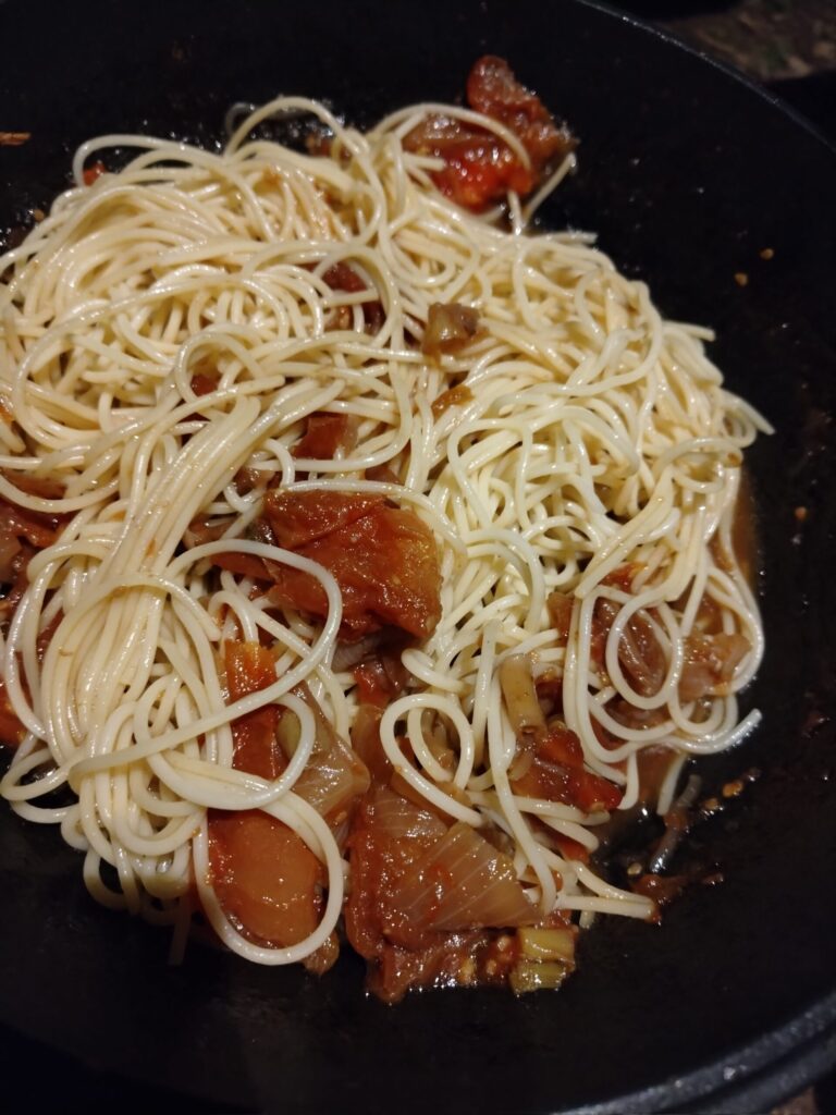 - 具材を食べ終わったら、茹でたスパゲッティを入れスープに絡める。