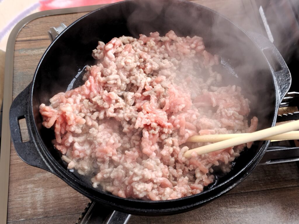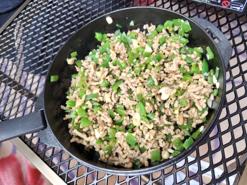 2. フライパンで挽き肉・ピーマン・しめじを炒め、お好みのスパイスで味付けします。