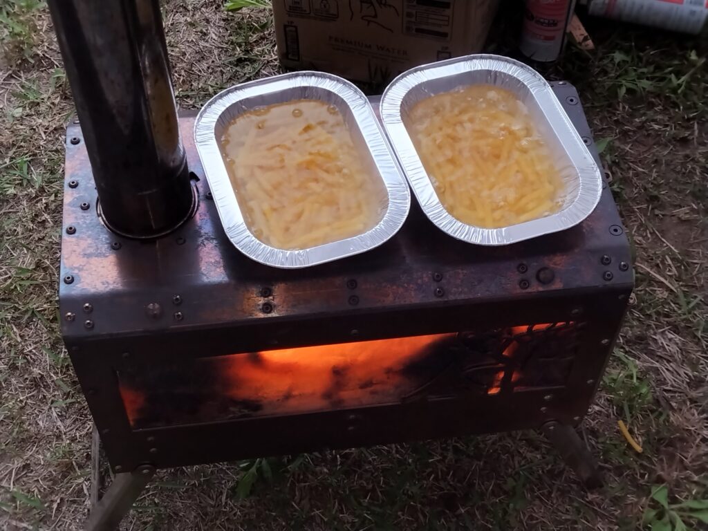 - 薪ストーブ(200〜240℃目安)に投入し、約10分ほど焼きます。