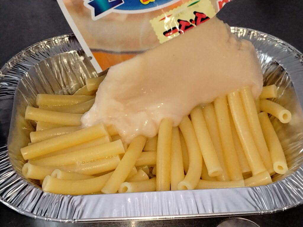- アルミ皿にマカロニと水を入れて火にかけ、マカロニが柔らかくなるまで煮ます。